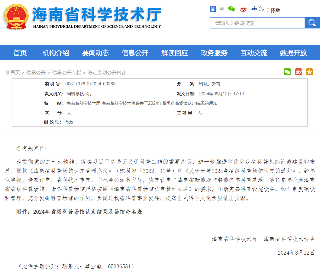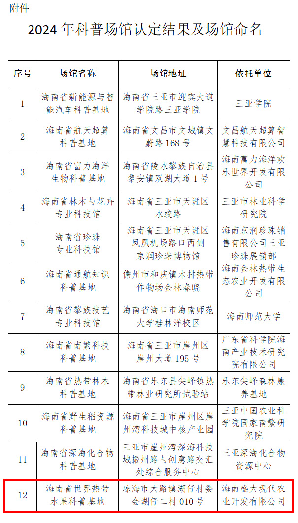 近日,省科技廳、省科協(xié)發(fā)布通知經(jīng)單位申報(bào)、專家評(píng)審、省科技廳審定、向社會(huì)公示等程序,決定認(rèn)定12家單位為海南省省級(jí)科普?qǐng)鲳^,其中,海南盛大現(xiàn)代農(nóng)業(yè)開發(fā)有限公司創(chuàng)建的世界熱帶水果之窗,入選為海南省世界熱帶水果科普基地。